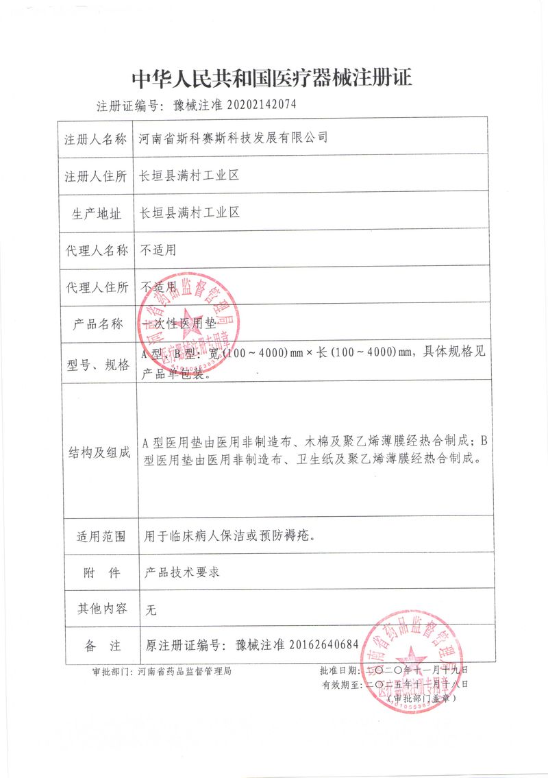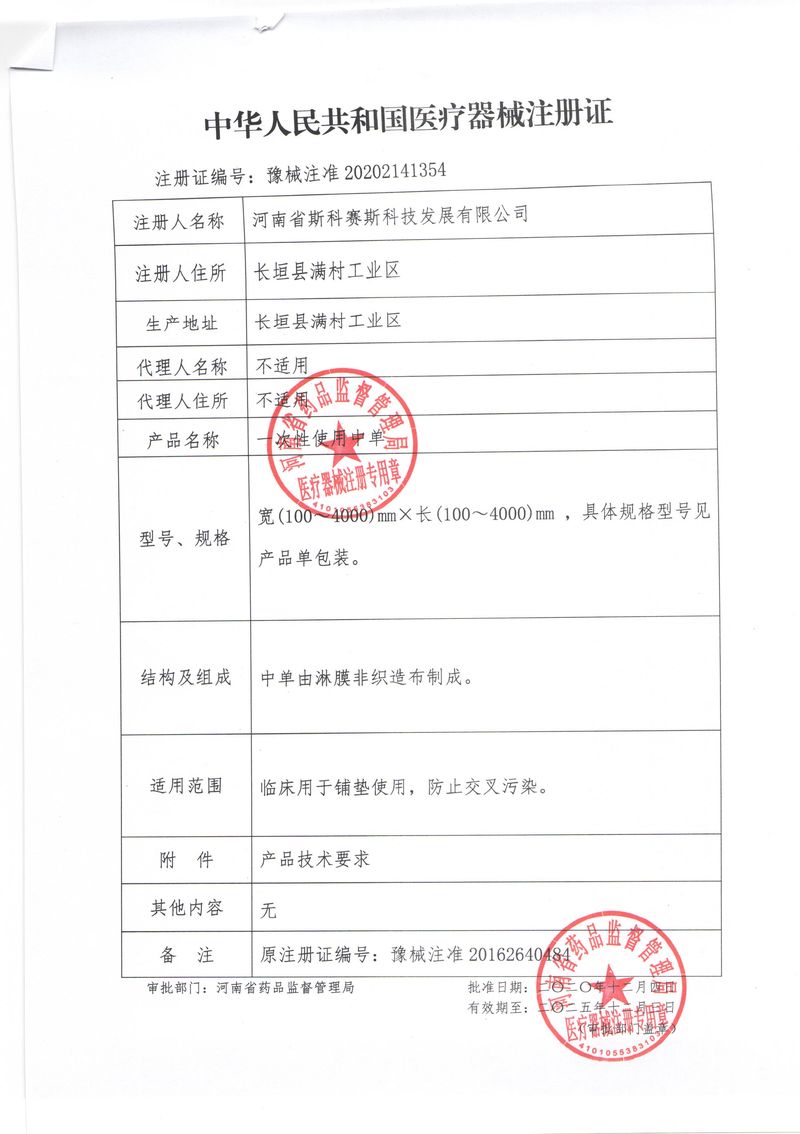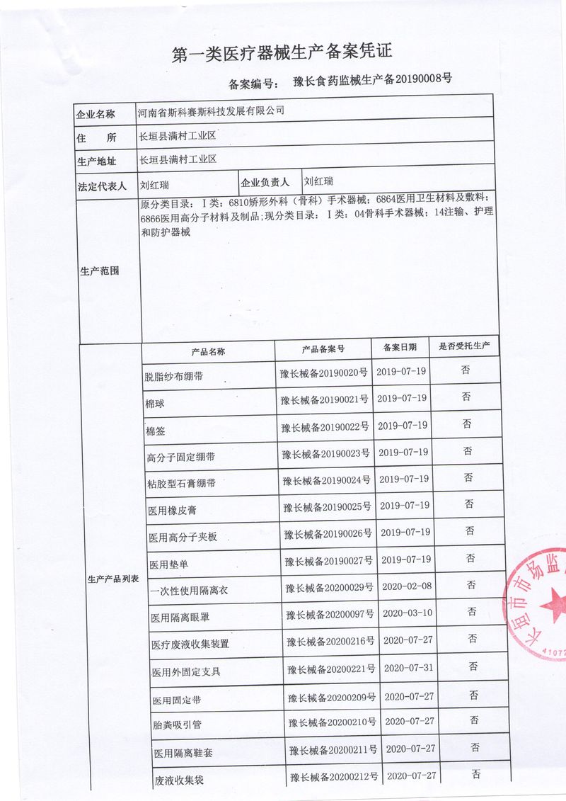 河南省斯科賽斯科技發(fā)展有限公司創(chuàng)建于 2011 年,位于“中國醫(yī)療耗材之都”- 河南省長垣縣,西臨 308 省道,南靠新菏鐵路,北依長濟高速,交通便捷,經濟發(fā)達,環(huán)境優(yōu)美。斯科賽斯積極進入醫(yī)療健康和服務領域,秉承為用戶創(chuàng)造價值的理念,專注于醫(yī)用耗材解決方案的研發(fā)和運營,并為用戶提供完善的產品解決方案;  斯科賽斯主要生產醫(yī)用麻醉系列、醫(yī)用高分子系列、醫(yī)用敷料包系列、醫(yī)用無紡布系列、醫(yī)用防護系列、醫(yī)用脫脂棉系列、生物材料制品類等七大類、100 多個品種、400 多個規(guī)格的產品。公司占地面積約 30000 平方米,建筑面積20000 平方米,擁有 10 萬級的凈化車間總面積 10000 平方米。擁有國際先進水平的生產設備和檢測儀器,技術裝備精良,檢測手段完善,為醫(yī)療行業(yè)的不斷發(fā)展進步提供保障。公司順利通過 ISO9001、ISO13485 質量管理體系認證?! ∷箍瀑愃箞猿盅邪l(fā)高科技新產品,力爭在醫(yī)療器械關鍵領域取得技術和研發(fā)的重大突破;立足國內和國際兩個市場,逐步實現(xiàn)管理理念、經營機制、人力資源、技術、產品、市場等全方位對接,提高企業(yè)的核心競爭力;過去的歲月里,斯科賽斯砥礪前行,誠信務實,銳意進取,不斷創(chuàng)新,用自己的睿智和辛勞,以富有責任感的使命,在探索中追求,在追求中超越,致力于成為值得信賴的醫(yī)療用品生產企業(yè)!在未來的日子里,斯科賽斯將一如既往豪情滿懷,信心百倍,攜手并肩,執(zhí)著追求,向更高的的目標前進,鑄造新的輝煌!